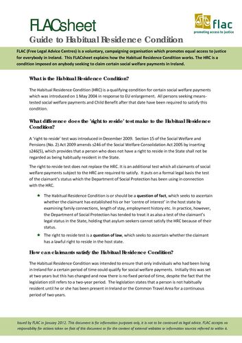 With regard to the Habitual Residence Condition, FLAC advises anyone who is affected to consult some of the organisations that offer advice and assistance to immigrants and asylum-seekers or their legal advisors. We regret that FLAC is not in a position to advise on individual applications.